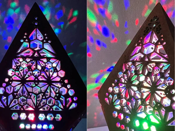 Bring enchantment to your space with this Geometric Pattern LED Lamp. Its eye-catching design and ambient lighting create a tranquil mood. The vibrant colors and intricate patterns project a mesmerizing display, making it a unique lighting solution for any room.