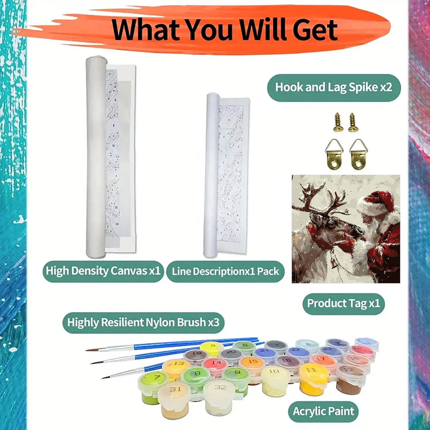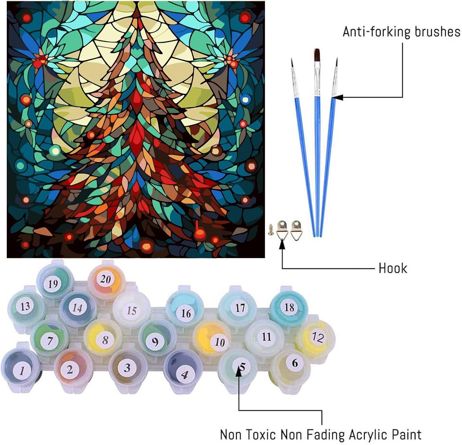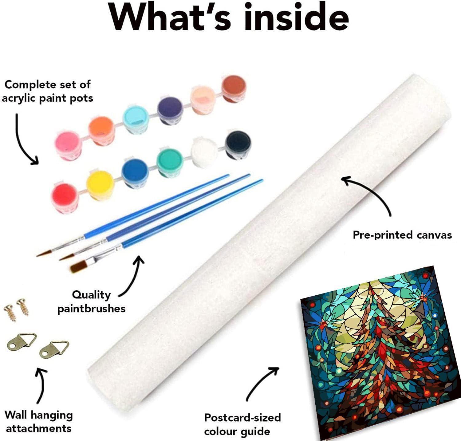 • Materials Included: Pre-numbered canvas, acrylic paints, paintbrushes, and instructions