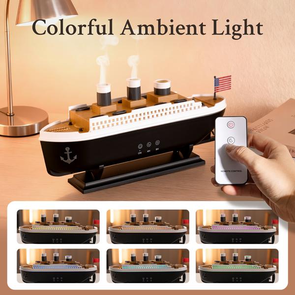 The Titanic Humidifier Aroma Diffuser is a 250ml ultrasonic mist device designed in a ship-inspired form that enhances indoor spaces with both visual lighting and aromatic diffusion. Featuring 7 adjustable LED colors, two mist modes, remote control functionality, and automatic shut-off, it supports convenient operation for bedrooms, offices, and hotel rooms.